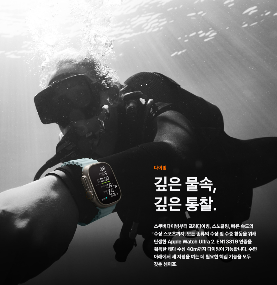 스쿠버다이빙부터 프리다이빙, 스노클링, 빠른 속도의 수상 스포츠까지, 모든 종류의 수상 및 수중 활동을 위해 탄생한 애플 워치 울트라 2는 EN13319 인증을 획득한 데다 수심 40m까지 다이빙이 가능해요.