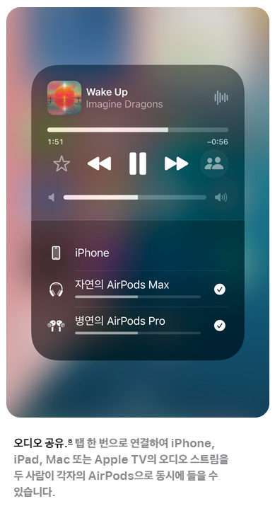 탭 한 번으로 연결하여 iPhone, iPad, Mac 또는 Apple TV의 오디오 스트림을 두 사람이 각자의 AirPods으로 동시에 들을 수 있어요.