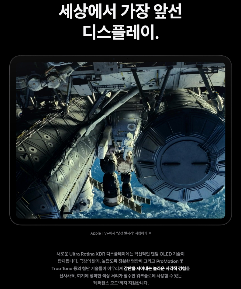 새로운 Ultra Retina XDR 디스플레이에는 혁신적인 탠덤 OLED 기술이 탑재되었어요. 극강의 밝기, 놀랍도록 정확한 명암비 그리고 ProMotion 및 True Tone 등의 첨단 기술들이 어우러져 감탄을 자아내는 놀라운 시각적 경험을 선사해요. 여기에 정확한 색상 처리가 필수인 워크플로에 사용할 수 있는 ‘레퍼런스 모드’까지 지원해요.