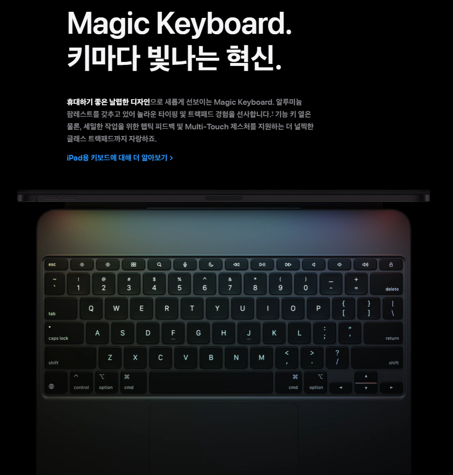 휴대하기 좋은 날렵한 디자인으로 새롭게 선보이는 매직 키보드는 알루미늄 팜레스트를 갖추고 있어 놀라운 타이핑 및 트랙패드 경험을 선사해요. 기능 키 열은 물론, 세밀한 작업을 위한 햅틱 피드백 및 멀티 터치 제스처를 지원하는 널찍한 글래스 트랙패드까지 자랑해요.