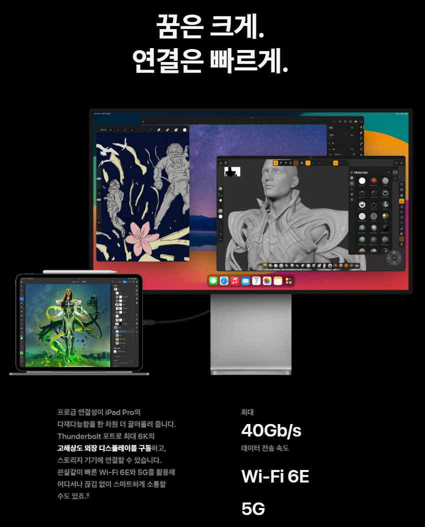 프로급 연결성이 iPad Pro의 다재다능함을 한 차원 더 끌어올려 줘요. Thunderbolt 포트로 최대 6K의 고해상도 외장 디스플레이를 구동하고, 스토리지 기기에 연결할 수 있어요. 쏜살같이 빠른 Wi-Fi 6E와 5G를 활용해 어디서나 끊김 없이 스마트하게 소통할 수 있어요.